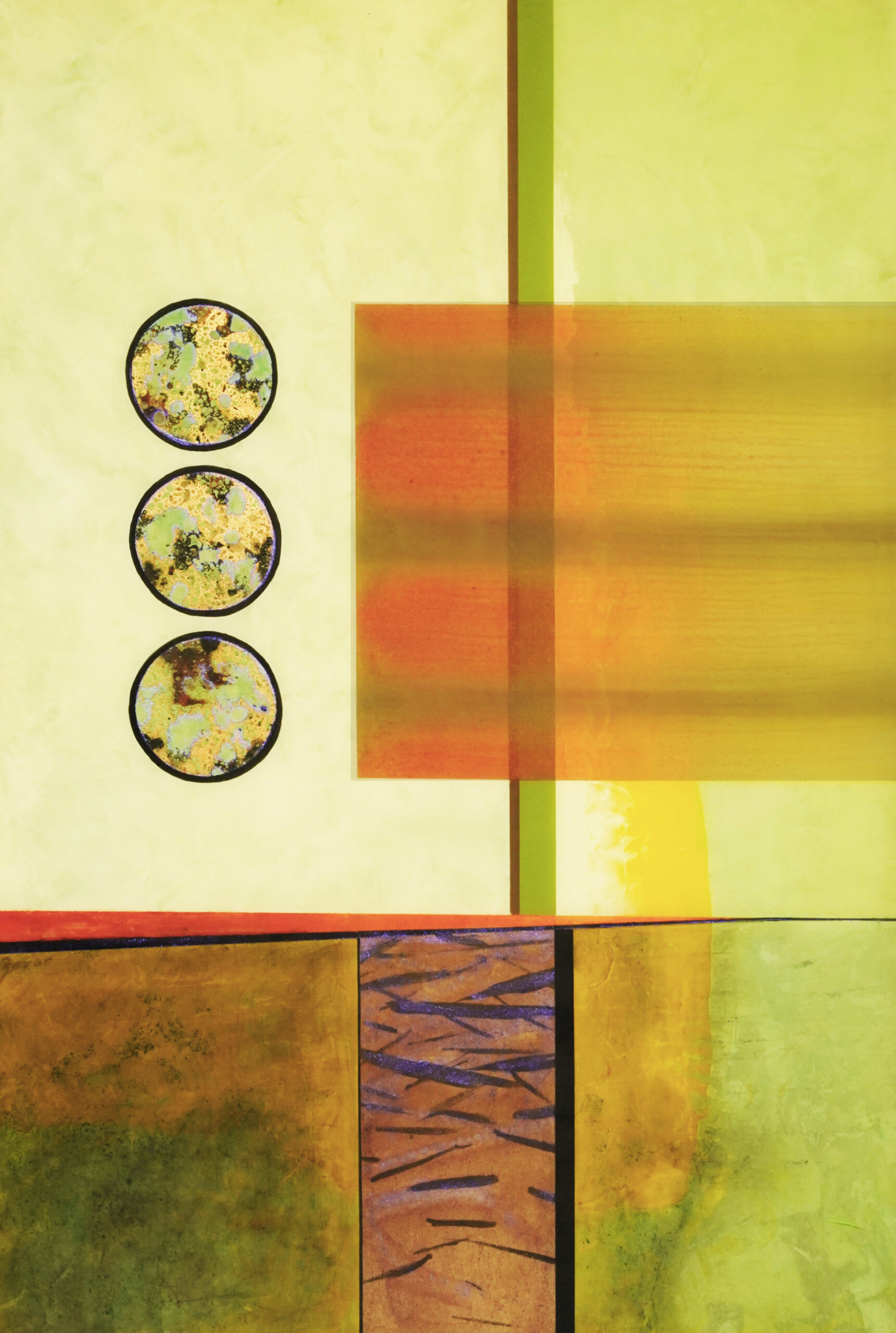 Acrylic painting with metallic elements, low sheen resin, on two-inch-deep wooden gallery box